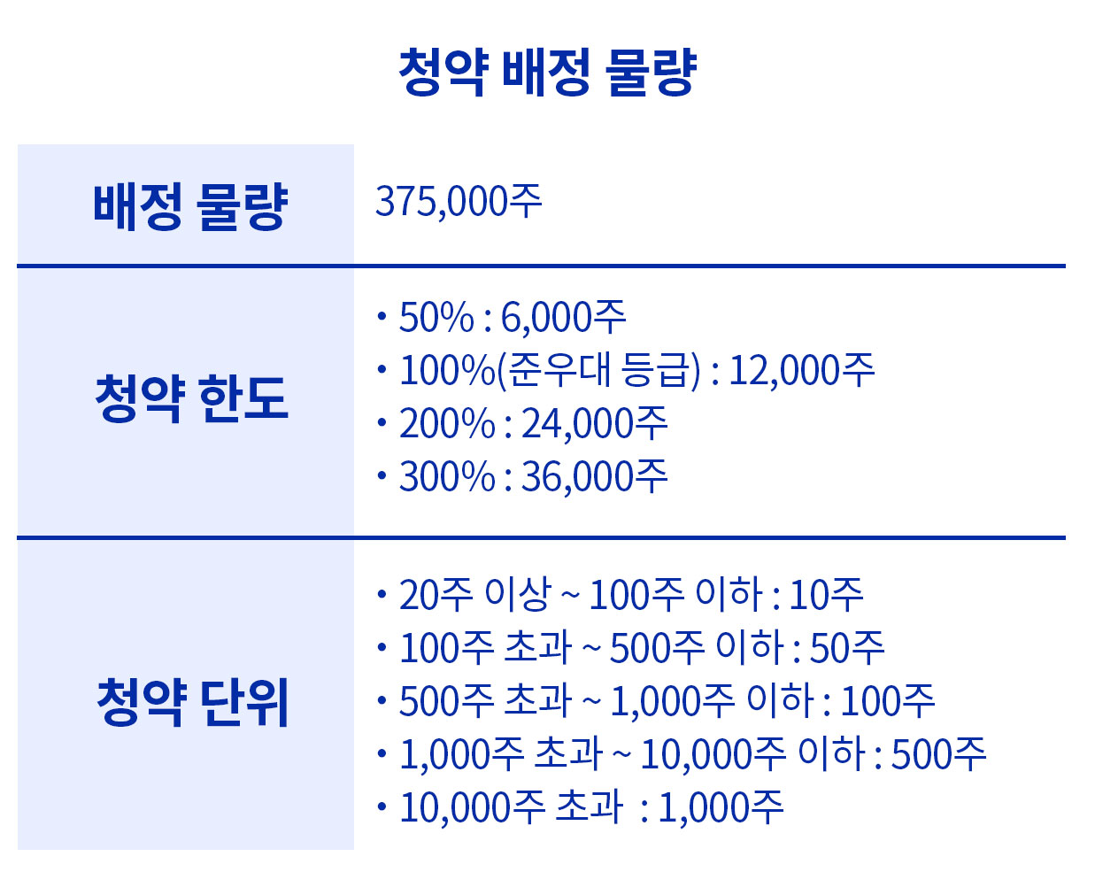 일반 청약자 대상 물량은 총 375,000주입니다. 코칩 공모주 수요예측 결과를 하고 최고 청약 한도까지 하시려는 분들은 온라인 고객은 50%인 6,000주까지 가능하며, 준우대등급은 12,000주, 우대 고객은 24,000주, 최고 우대 고객은 36,000주까지 가능합니다. 청약 수량별로 단위가 다르니 청약을 하시기 전에 확인 후 청약하시는 것이 좋습니다.