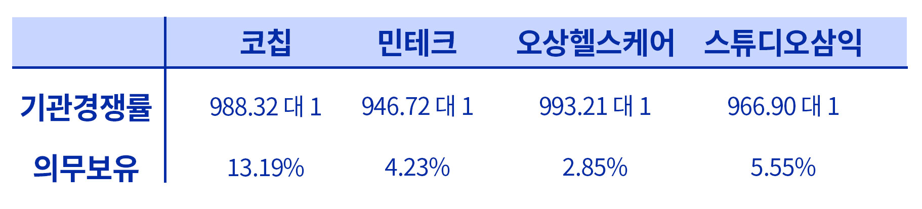 코칩 공모주 수요예측 결과 경쟁률이 비슷한 다른 공모주와 비교해 봐도 마찬가지입니다. 900대 이상의 경쟁률로 마무리된 다른 공모주와 비교해 볼 때, 의무보유 확약 비율이 상당히 높은 것을 확인할 수 있습니다.