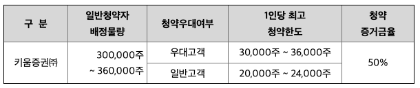 키움증권 우대고객과 일반 고객 최고 청약 한도입니다. 일반 청약자 배정 물량은 아직 정확하지는 않지만 300,000주 ~ 360,000주 예정이며, 일반 고객의 경우에는 20,000주 ~ 24,000주까지 청약이 가능할 것 같습니다. 더 정확한 수치는 24일 확정 공모가가 나오면서 결정이 되겠지만 우대고객의 경우에는 30,000주에서 36,000주까지 청약이 가능합니다. 청약 증거금은 20주를 하든 24,000주를 하든 모두 50%가 준비되어 있어야 합니다.