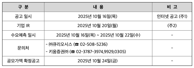 큐리오시스 공모주 증권신고서를 보고 이해하기 어려워도 괜찮습니다. 공모주를 투자하는 경우 기관 투자자의 생각과 행동을 미리 알 수 있기 때문입니다. 바로 수요예측인데요, 일반 청약일정 전에 기관 투자자를 대상으로 수요예측을 하고 경쟁률과 의무보유 확약 비율을 공고합니다. 만약 큐리오시스 공모주 수요예측 결과의 경쟁률이 높았다면 우리는 그걸 보고 기관 투자자가 이 공모주에 얼마나 많은 관심이 있는지 확인할 수 있습니다. 또한 의무보유 확약 비율이 높다면 이를 통해서 기관 투자자가 이 공모주가 얼마나 괜찮다고 평가하는지 슬쩍 알아볼 수 있는 것입니다. 큐리오시스 공모주의 수요예측 일시는 다음 달 16일부터 22일까지 진행되며, 이 결과를 참고하여 주관사와 기업이 공모가를 확정하여 24일에 발표합니다.