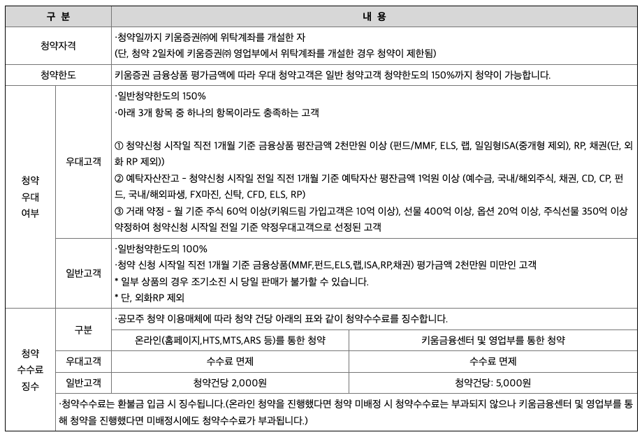 큐리오시스 비례 배정 물량을 생각하고 계신 분들을 위해서 일반 고객과 우대 고객의 청약 한도에 대해 설명드리자면, 일반 고객의 경우 보통 최고 청약 한도의 100%까지만 청약이 가능하지만 우대 고객의 경우 150%까지 가능합니다. 우대고객이 되는 경우는 몇 가지 조건이 있는데, 자세한 사항은 위 표 내용을 참고해 주시면 됩니다.