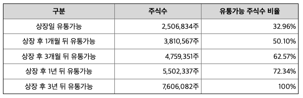 큐리오시스 공모주 상장 직후 유통 가능 물량입니다. 상장 직후에는 총 32.96%가 매도 가능하며, 1개월 후에는 50% 물량이 시장에 나올 수 있습니다. 많은 물량이 증시에 나올 수 있으므로 해당 기간을 확인하고 매도 전략을 세워야 합니다. 큐리오시스 공모주는 상장 3년 이후에는 모든 수량이 시장에서 거래될 수 있습니다.