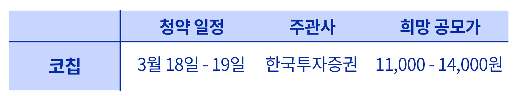3월 공모주 청약일정 중에서 3주 차가 가장 바쁠 것 같습니다. 스팩주를 제외하고도 총 3개의 공모주가 대기하고 있습니다. 먼저 3주 차에서 가장 먼저 시작되는 코칩에 대해서 알아보도록 하겠습니다. 코칩은 소형, 초소형 형태의 슈퍼커패시티 제품을 제조하는 기업입니다.