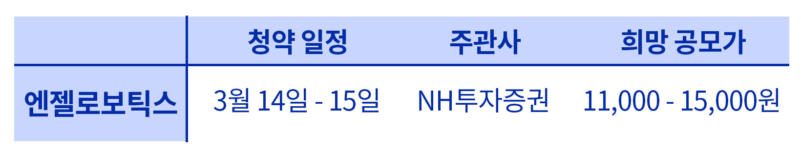 엔젤로보틱스의 3월 공모주 청약일정은 14일부터 15일까지입니다. 주관사는 NH투자증권이며 희망 공모가 밴드는 11,000 ~ 15,000원입니다. 보통 영업일 기준으로 이틀 후에 배정 공고 및 환불이 되기 때문에 3월 19일(화)에 환불될 가능성이 있습니다. 엔젤로보틱스 상장일 유통 가능 물량은 27.72%입니다.