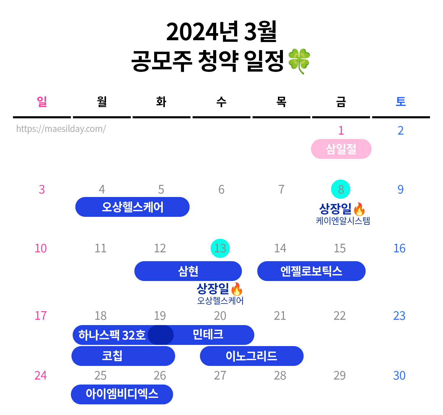 위 이미지 파일은 3월 공모주 청약일정을 한 번에 살펴볼 수 있도록 제가 정리한 것입니다(출처를 꼭 밝혀주시면 감사하겠습니다). 맨 처음 소개해드릴 공모주는 오상헬스케어입니다. 이 포스팅 직전에 제가 오상헬스케어 수요예측 결과 및 공모주 청약에 관한 내용들을 자세히 정리했었습니다.