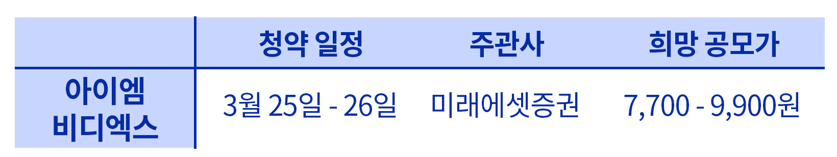 2월 말에 공모주 일정을 정리할 때 아이엠비디엑스 청약 일정이 13~14일이었던 것 같은데 오늘 포스팅하려고 다시 한번 확인해 보니까 25~25일로 되어있었습니다. 공모주 일정은 청약 며칠 전이라도 변경될 수 있으니 꼭 한번 더 확인하시는 편이 좋을 것 같습니다.