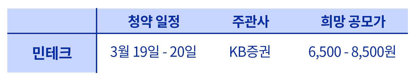 민테크 3월 공모주 청약일정에 대해 알아보겠습니다. 주관사는 KB증권이며 청약은 19일부터 20일까지 가능합니다. 환불 및 배정 공고 예정일은 22일이며, 희망 공모가 밴드는 6,500원 ~ 8,500원입니다. 신주 모집 100%로 진행될 예정이라고 합니다.