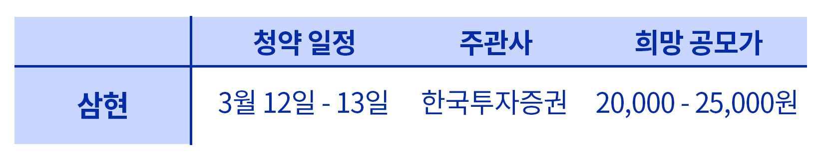 수요예측 결과가 마무리되기 전 기준으로 살펴보겠습니다. 모집 총액은 4백억 원이며 한국투자증권이 주관합니다. 희망 공모가 밴드는 20,000원에서 25,000원이며 상장일 유통 가능한 물량은 18.38%입니다. 삼현의 3월 공모주 청약일정은 3월 12일부터 13일까지입니다.