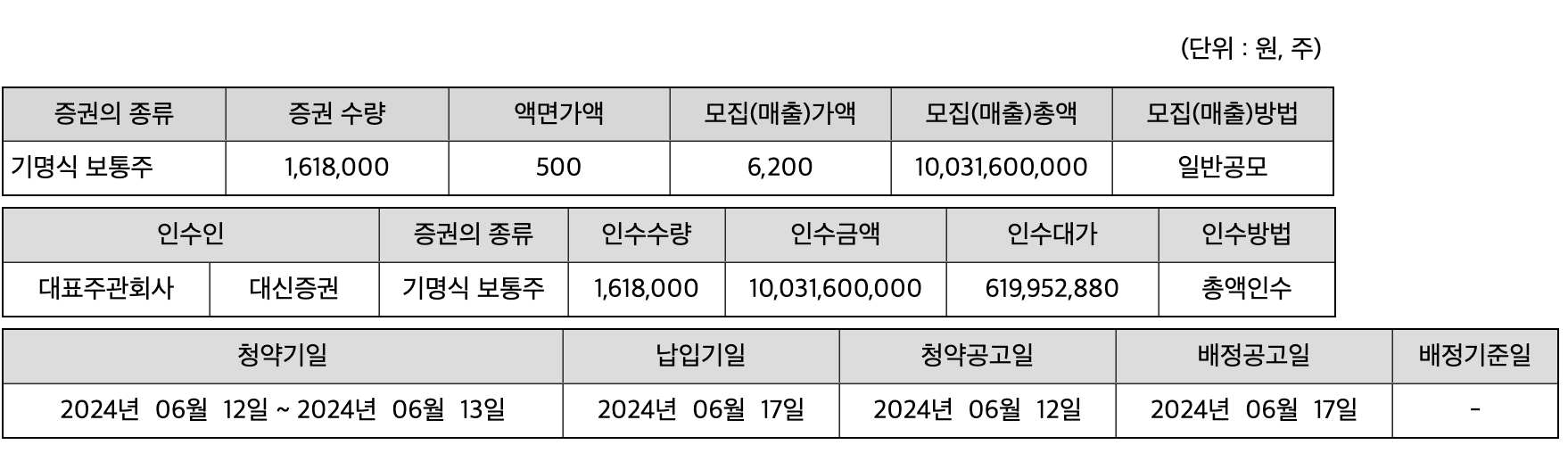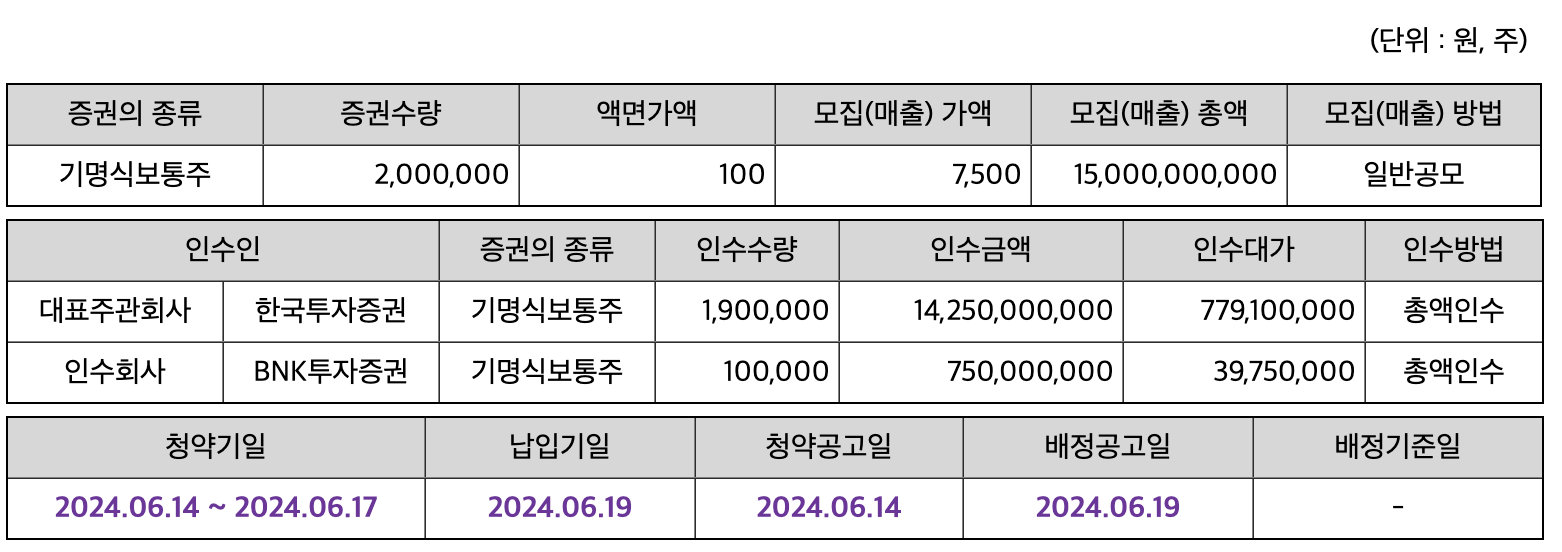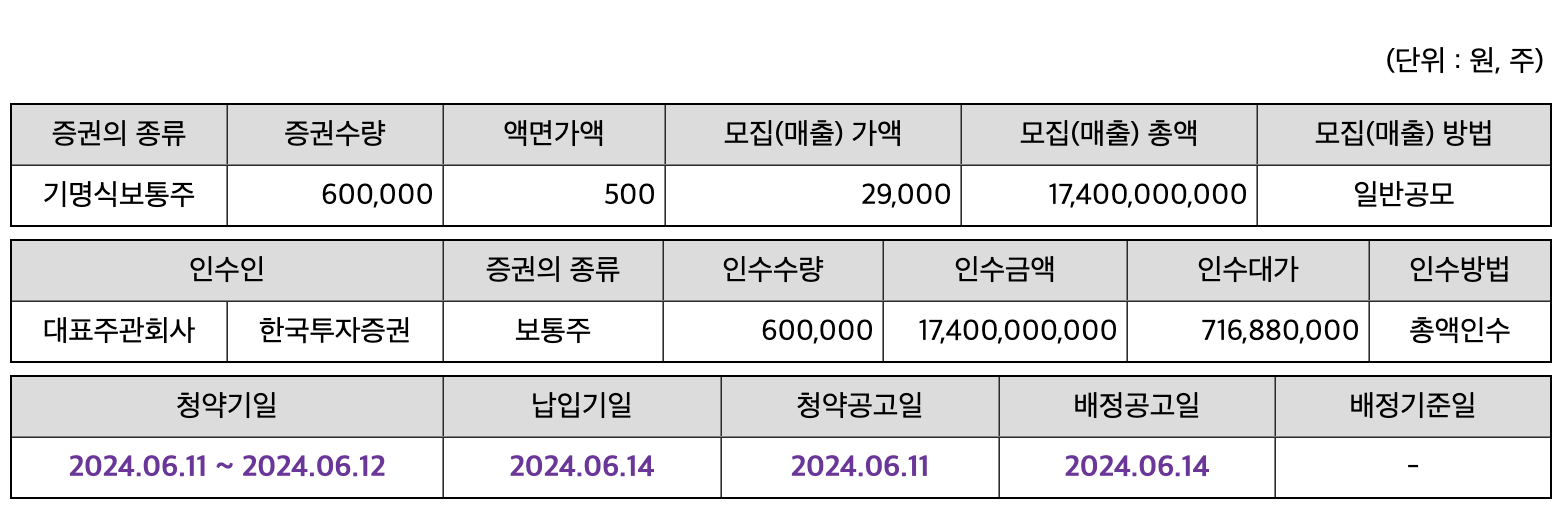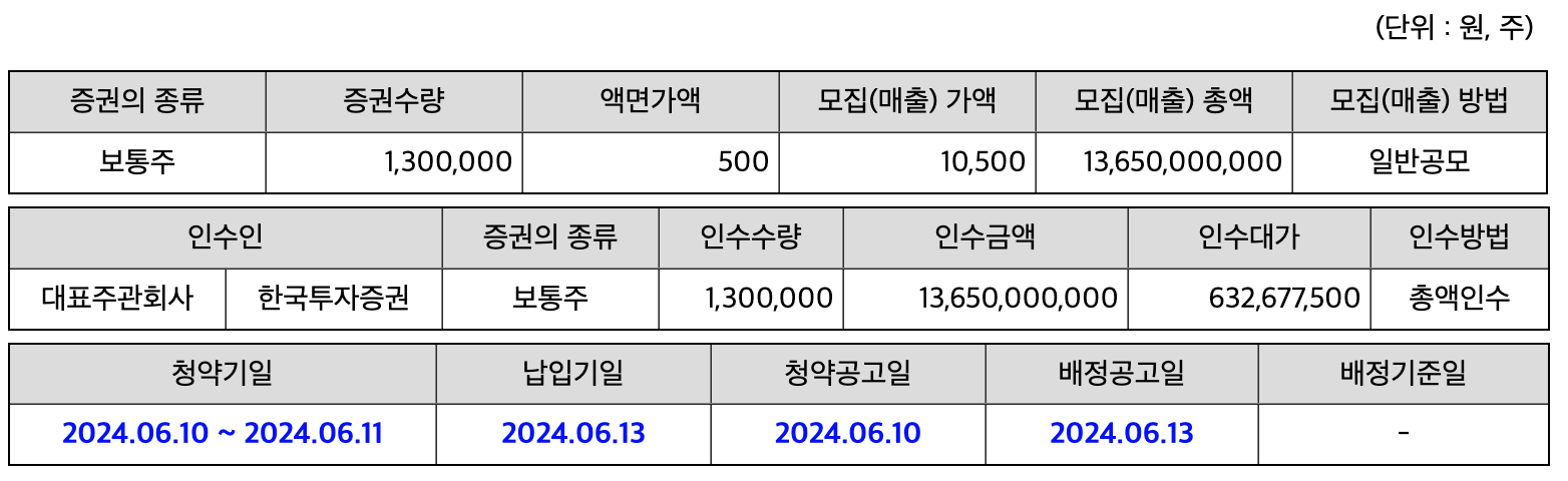 - 공모주 청약 일정 : 2024년 6월 5일(수) ~ 7일(금)