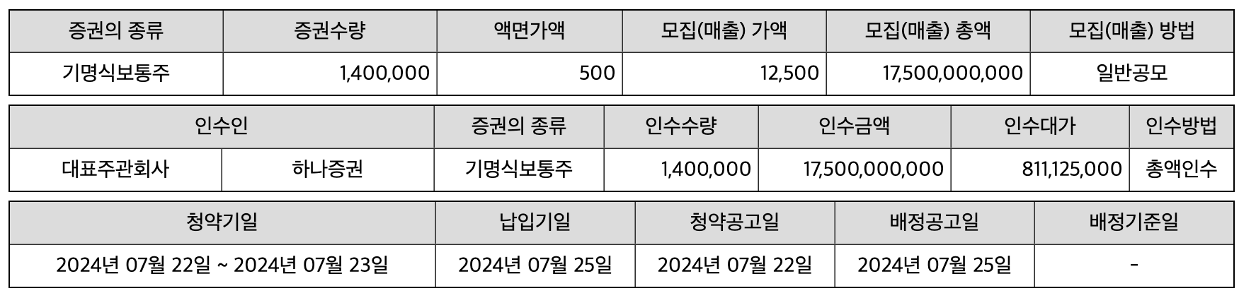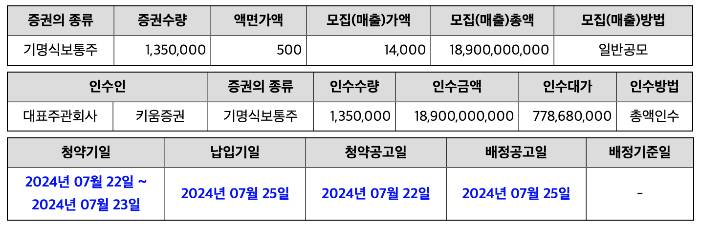 케이쓰리아이는 7월 22일부터 23일까지 하나증권을 통해서 공모주 청약이 가능합니다. 하나증권은 2024년 7월 공모주 청약일정에서 처음 보는 주관사입니다. 공모주 청약할 때 자주 보지 못한 증권사는 계좌가 잠들어 있거나 없는 경우가 있으니 일정 전에 청약 가능한 계좌가 개설되어 있는지 꼭 확인하시는 편이 좋습니다. 저는 예전에 대신증권이 없어진 줄 모르고 가만히 있다가 청약을 한번 못했었습니다.