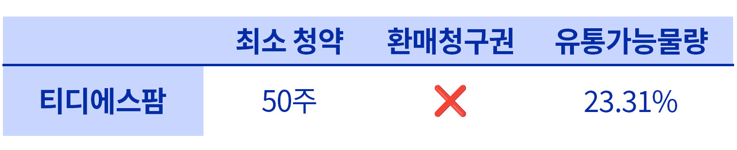 티디에스팜의 최소 공모 청약 수량은 50주입니다. 희망 공모가에서 가장 낮은 금액(9,500원) 기준으로 237,500원이 필요합니다. 상장일에 유통 가능한 물량은 23.31%이며, 환매 청구권은 없습니다.