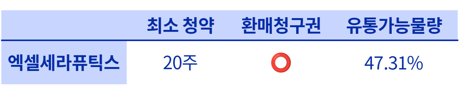 한 가지 다행인 점은 금번 공모주는 환매청구권을 일반 청약자에게 부여합니다. 일반 청약자 대상으로 90% 가격으로 공모주를 되팔 수 있는 권리를 주기 때문에 적어도 큰 손해를 입을 걱정은 하지 않아도 되는 것이 엑셀세라퓨틱스 공모주의 장점입니다.