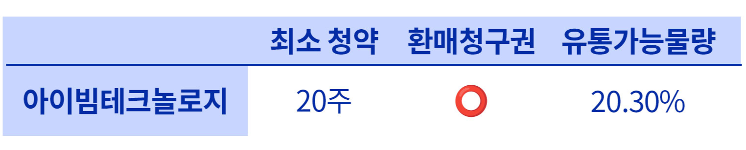 7월 공모주 청약일정에는 환매청구권이 많이 없는 편인데, 아이빔테크놀로지는 일반 청약자에게 이러한 권리를 부여한다는 점이 장점인 것 같습니다. 공모가가 다소 작을 것으로 예상되기 때문에 최소 청약 수량만 하는 경우 수수료가 부담될 수 있으니 유의하시길 바랍니다.