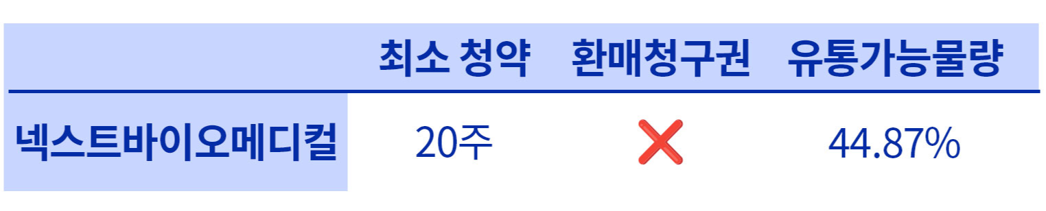 넥스트바이오메디컬 또한 환매청구권이 없으며, 상장일에 유통 가능한 물량은 44.87%로 다소 높은 편입니다. 공모가가 어느 정도 있는 편이라서 최소 청약 수량은 20주가 된 것 같습니다.