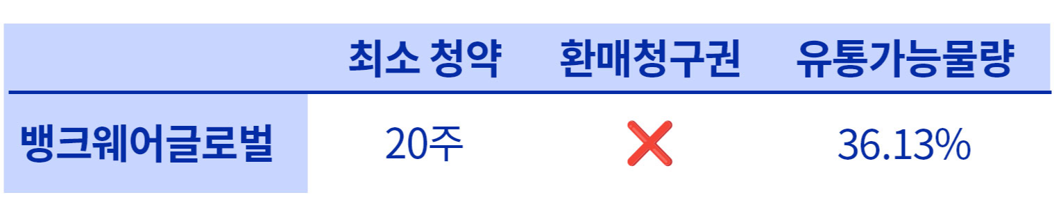 뱅크웨어글로벌을 최소 청약만 하는 경우에는 20주부터 청약이 가능하며 최고 청약 가능 수량은 확정 공모가가 나오는 대로 자세하게 정리해 보도록 하겠습니다. 7월 공모주 청약일정에는 환매 청구권을 주는 공모주가 많이 없는 편인데, 뱅크웨어글로벌도 일반 청약자에게 이러한 권리를 부여하지 않습니다. 상장일에 유통가능한 물량은 36.13%로 공모가가 다소 출렁거릴 수 있을 것 같습니다.