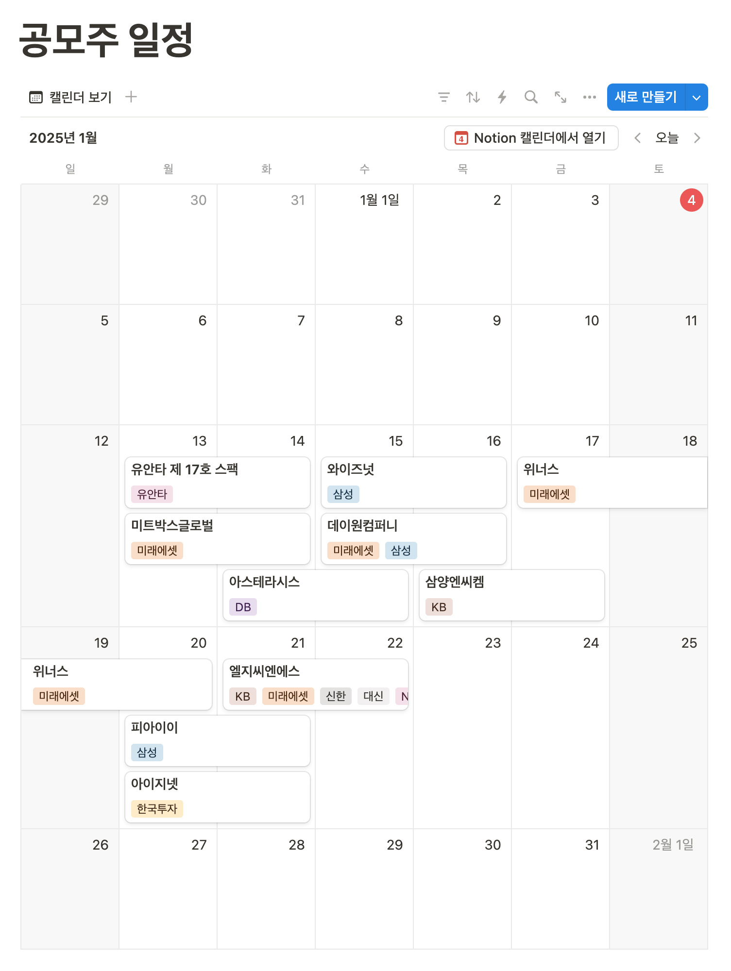 제 청약 캘린더를 살펴보신 분들이라면 바뀐 이미지를 눈치채셨을 것 같습니다. 예전에는 하나씩 다 그려가면서 정리했는데, 이제는 노션 캘린더를 사용하고 있습니다. 여러 가지 기능이 있어서 정리하기는 쉽고 전달하기는 더욱 좋아진 것 같습니다. 2025년 1월 공모주 청약일정부터 이제는 이런 이미지를 사용해 볼까 합니다.