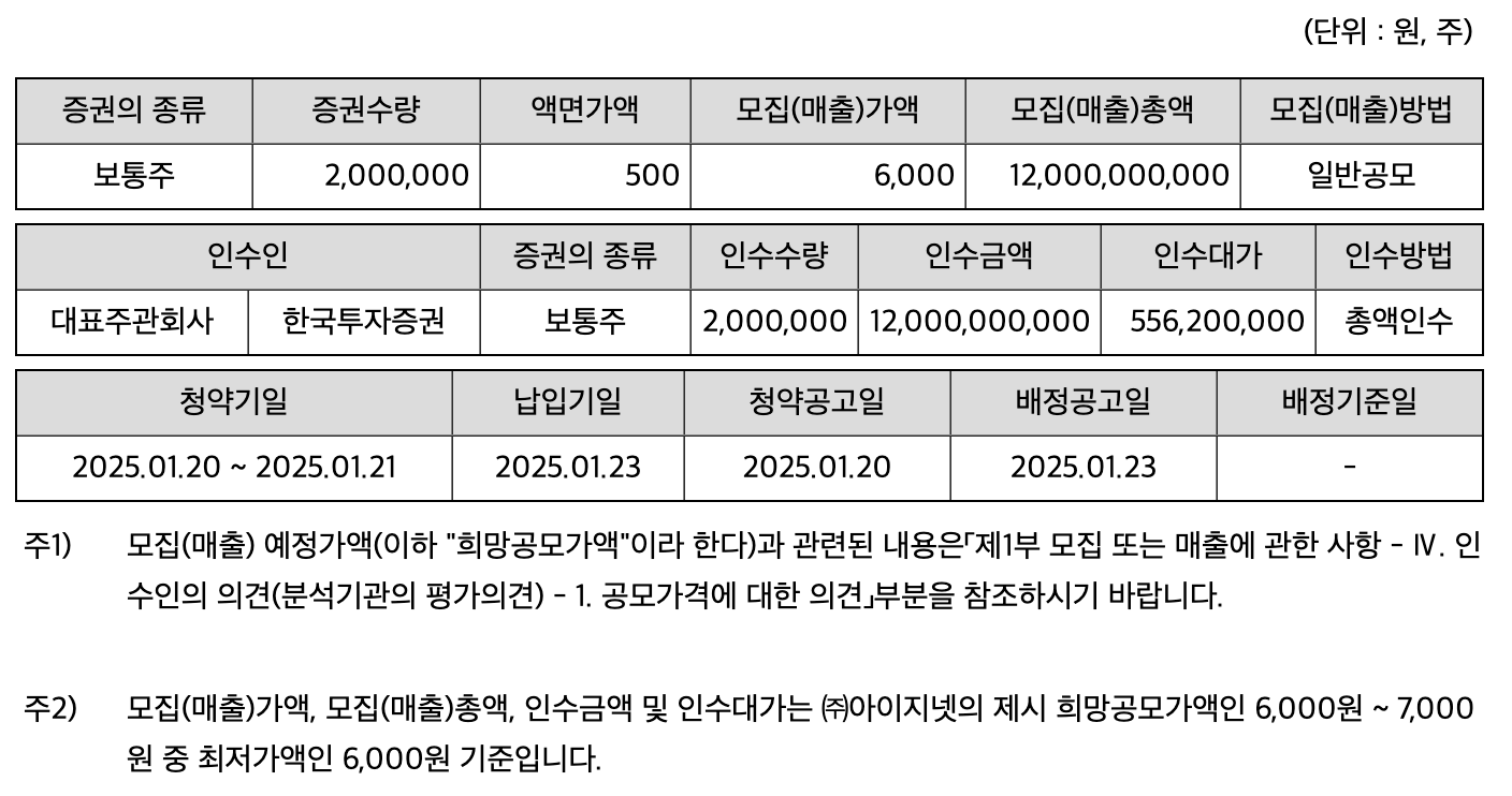 1월 공모주 청약일정 정리도 거의 마무리가 되어갑니다. 다음으로 알려드릴 공모주는 아이지넷입니다. 아이지넷은 한국투자증권에서 20일부터 21일까지 청약이 가능하며, 희망 공모가 밴드는 6,000원에서 7,000원입니다. 우려스러운 부분은 아이지넷 다음에 있는 공모주가 1월에서 가장 기대되는 공모주로 꼽히는 LG CNS라 사람들의 관심이 덜 할 것 같다는 생각이 듭니다.