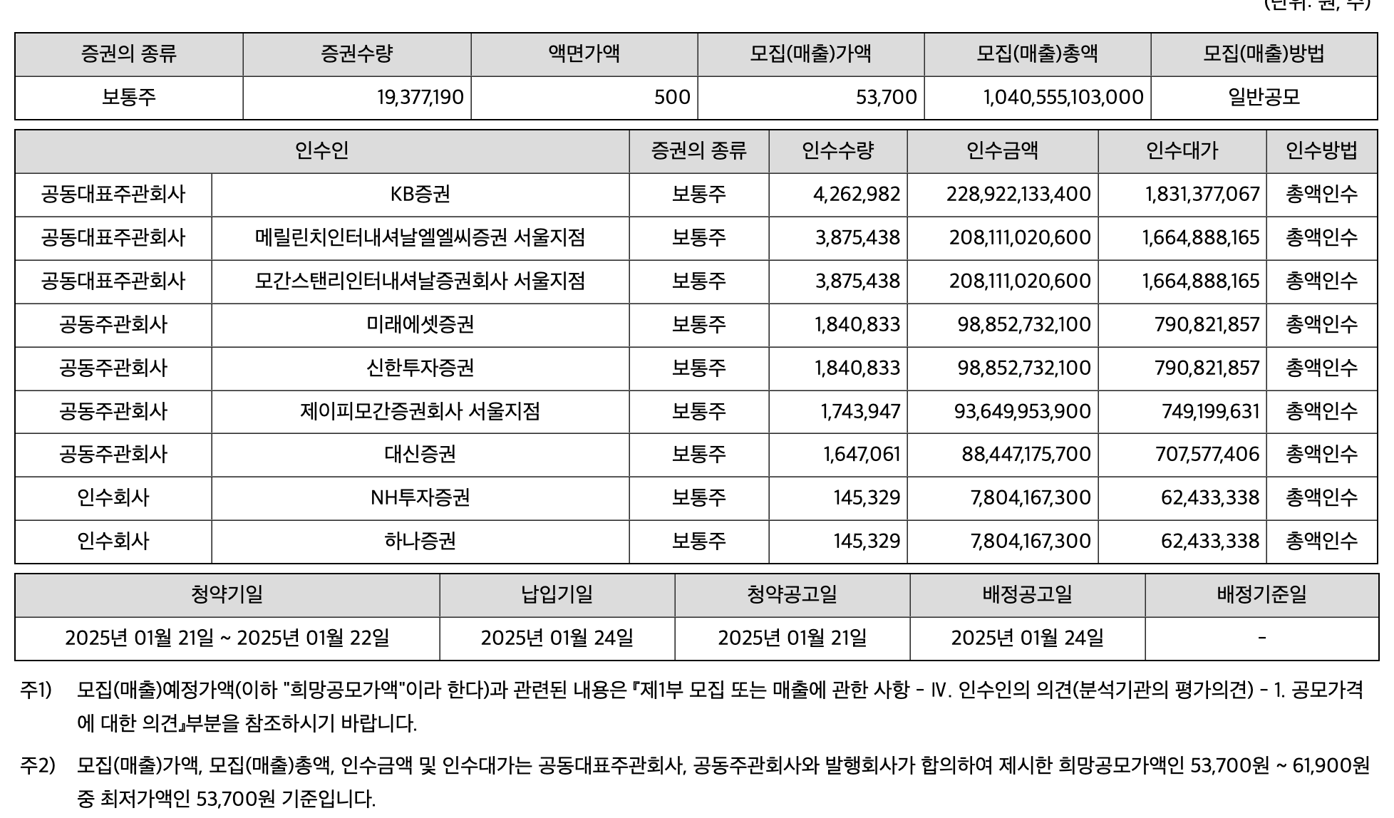 다음으로 LG CNS입니다. 1월 공모주 청약일정 중에서 가장 관심도가 높은 기업인데, 가장 마지막에 등장했습니다. 현재 전자공시에 올라와 있는 희망 공모가 밴드는 53,700원~61,900원이지만 수요예측 결과가 마무리되고 최종 공모가가 확정되기 전까지는 모두 예정인 금액입니다. 위 이미지를 보시면 엘지씨엔에스 주관사는 상당히 많은 것을 알 수 있습니다. 대표 주관사로는 KB증권이 있으며, 공동주관사로는 미래에셋증권, 신한투자증권, 대신증권 그리고 NH투자증권, 하나증권이 있습니다. 청약을 원하시는 분들은 엘지씨엔에스 공모주 청약일인 21일부터 22일까지 청약하실 수 있습니다.