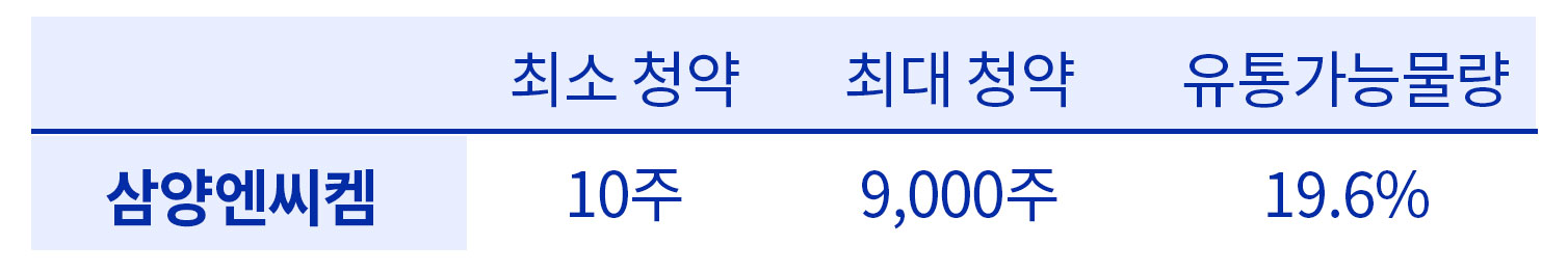 삼양엔씨켐의 최소 공모 청약수량은 10주로, 2025년 1월 공모주 청약일정에 있는 공모주 중에 가장 적습니다. 예전에는 보통 최소 수량이 10주였는데 요즘은 거의 20주부터 시작해서 아쉬웠는데 10주를 보니 반가운 마음이 듭니다. 유통 가능 물량 또한 19.6%입니다. 경쟁률과 의무보유 확약 비율이 괜찮게 나왔으면 좋겠습니다.
