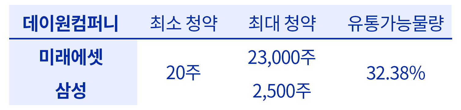 데이원컴퍼니는 주관사가 총 두 곳입니다. 미래에셋증권과 삼성증권 모두 최소 청약 수량은 20주이며, 최대 청약 수량은 미래에셋이 23,000주, 삼성증권이 2,500주입니다. 데이원컴퍼니 상장일에 유통 가능한 물량은 32.38%입니다.