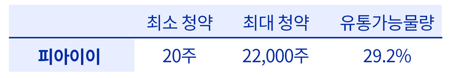 피아이이의 청약 수량과 유통 물량을 살펴보도록 하겠습니다. 피아이이의 희망 공모가 밴드가 그렇게 높지 않은 편이라 균등 배정은 다소 걱정이 되지만, 배정 물량이나 수익률에 따라서 달라질 수 있어서 알려드리자면 최소 청약 수량은 20주이며 최대 청약 수량은 22,000주입니다. 유통 가능 물량은 29.2%로 보통 정도입니다.