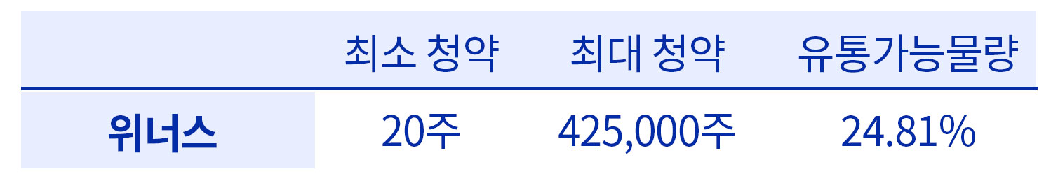 위너스의 최소 공모 수량은 20주이며 최대 청약 가능한 수량은 425,000주입니다. 최대 청약 가능한 수량은 증권사의 우대 기준에 따라 달라질 수 있으니 이러한 점은 제가 청약일정이 다가오면 자세히 한번 정리를 하도록 하겠습니다. 위너스의 유통 가능한 물량은 24.81%으로 괜찮은 편입니다.