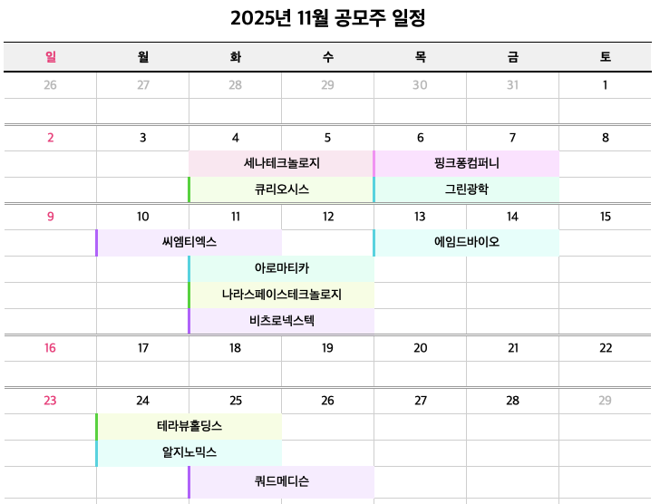 이렇게 2025년 11월 공모주 청약일정을 모두 살펴봤습니다. 10월에는 청약 일정이 정말 적어서 아쉬웠는데 11월에는 다양한 업종의 기업들이 상장을 준비하고 있어 오랜만에 바쁘고 기분이 좋습니다. 기업, 바이오, 뷰티 등 분야도 다양하고 더핑크퐁컴퍼니처럼 사람들에게 익숙한 기업까지 골고루 포함되어 있는 것 같다는 생각이 듭니다.
