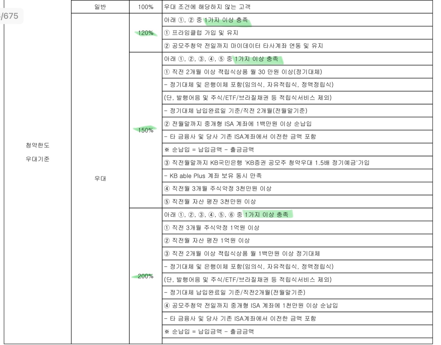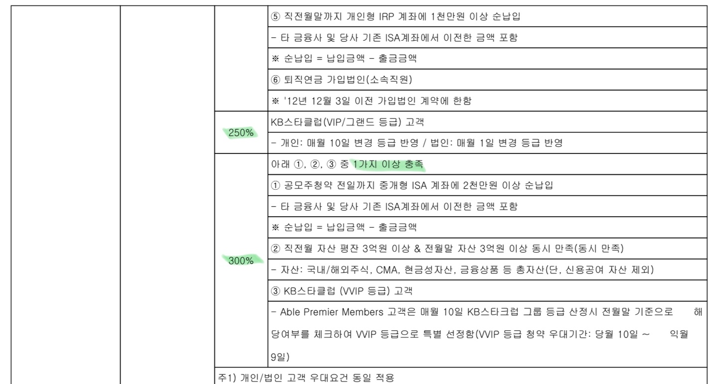 KB증권의 우대 고객 기준에 대해 정리한 이미지입니다. 각 해당 조건에서 1가지 조건을 충족해야 하며 예외조건이나 추가 조건이 있을 수 있으니 해당 사항은 전자공시 또는 증권사에 문의하시는 편이 좋을 것 같습니다.