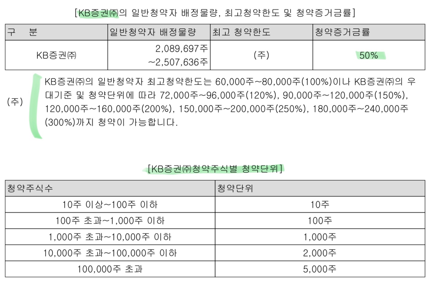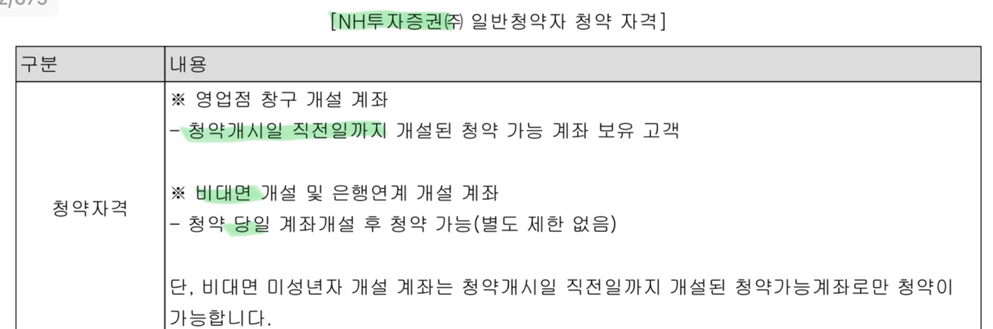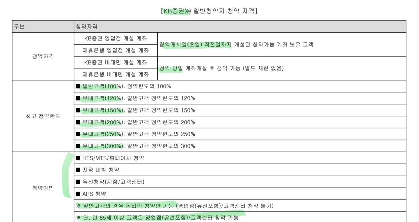 먼저 대표주관사인 KB증권입니다. 가장 많은 물량을 배정받은 증권사이기 때문에 청약 자격이 가장 궁금하실 겁니다. KB증권은 비대면 개설 계좌 고객인 경우 청약일에도 계좌 개설 후 청약이 가능하지만 영업점에서 계좌를 개설한 경우에는 청약 전날까지 계좌 개설이 모두 완료되어야 합니다.
