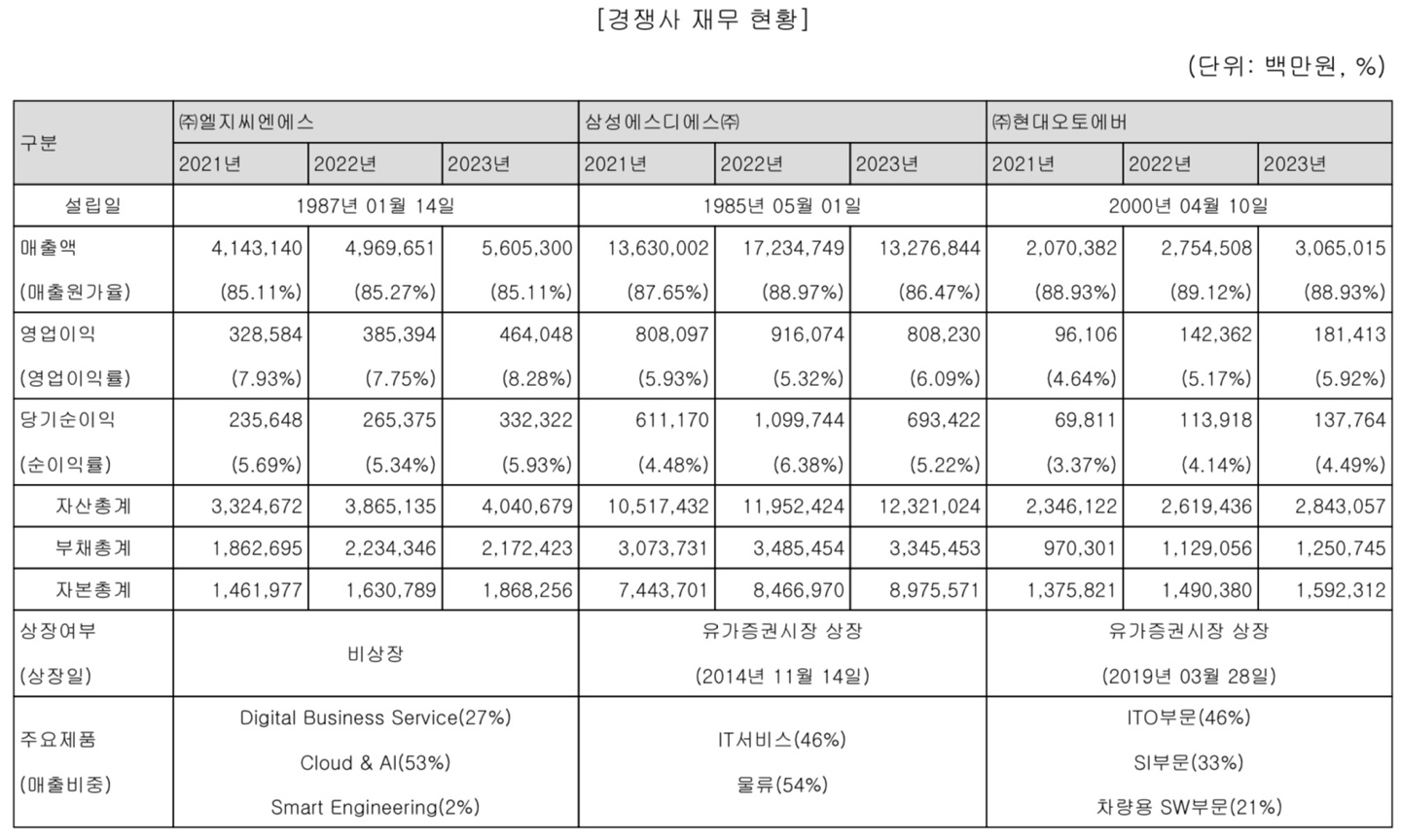 LG CNS의 경쟁사 재무 현황도 함께 확인할 수 있습니다. 경쟁사에는 삼성에스디에스와 현대오토에버가 있습니다. 삼성에스디에스와는 비슷한 시기에 설립이 되었으며, 14년도에 유가증권시장에 상장한 기업입니다. 현대오토에버는 두 기업에 비해 다소 늦게 설립을 하였는데, LG CNS보다 이전에 증권 시장에 입성한 것을 확인할 수 있습니다. 각 기업별 주요 제품의 매출 비중도 전자 공시에서 모두 볼 수 있습니다. LG CNS 상장 이후에는 이제 정말 증권 시장에 올라온 것이기 때문에 이런 경쟁사의 매출과 제공하는 제품을 유사하게 볼 필요가 있습니다.
