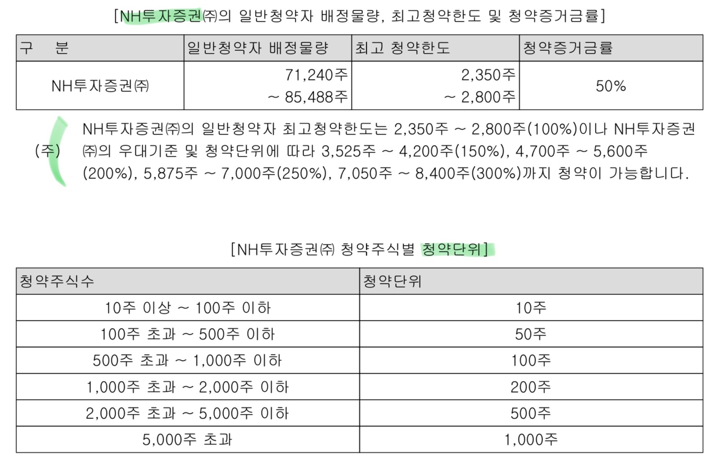 마지막으로 NH투자증권과 하나증권입니다. NH투자증권의 일반 고객은 2,350주 ~ 2,800주까지 가능하며 하나증권은 3,500주 ~ 4,000주까지 가능합니다. 하나증권은 전자공시에서 우대 고객의 기준과 어느 정도까지 물량이 늘어나는지 확인할 수 없었지만, NH투자증권의 경우에는 우대 기준에 따라 최대 300%까지 청약이 가능한 것을 확인할 수 있습니다.