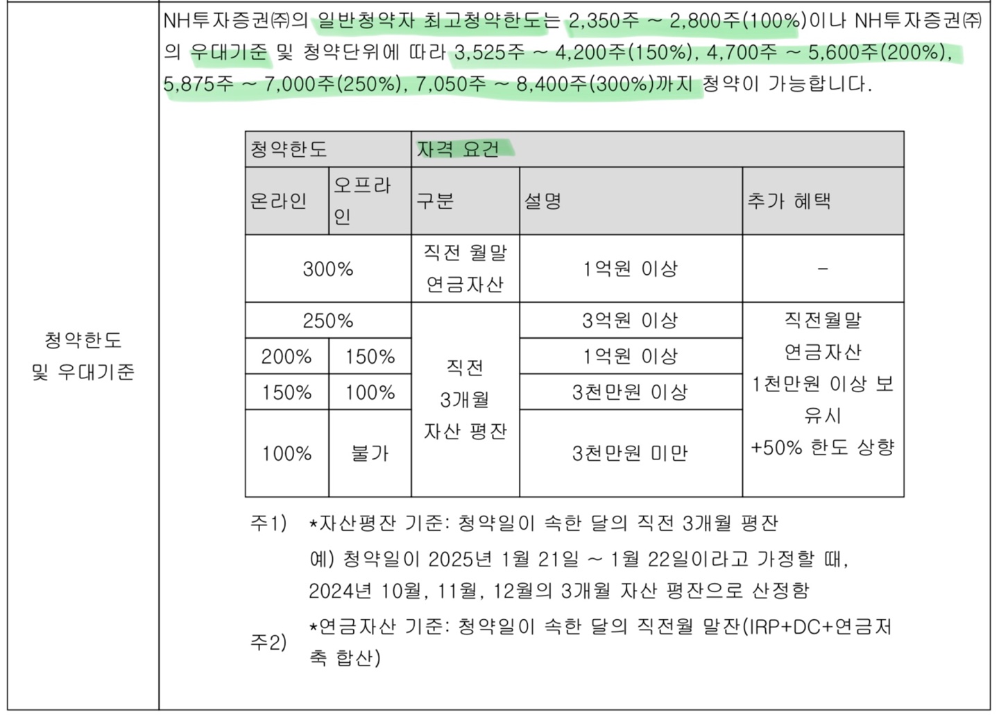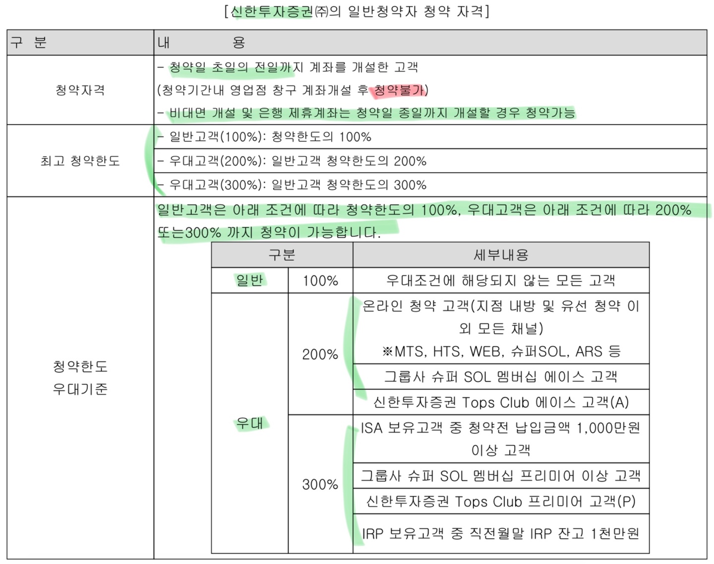 일반 고객의 경우에는 청약 한도의 100% 가지 가능하며, 우대고객은 우대조건 달성 여부에 따라 120%~300%까지 청약 한도가 조정됩니다. 일반 고객의 경우에는 한 가지 더 제약이 있는데, 온라인 청약만 가능하다는 점이 있으니 유의하시길 바랍니다.