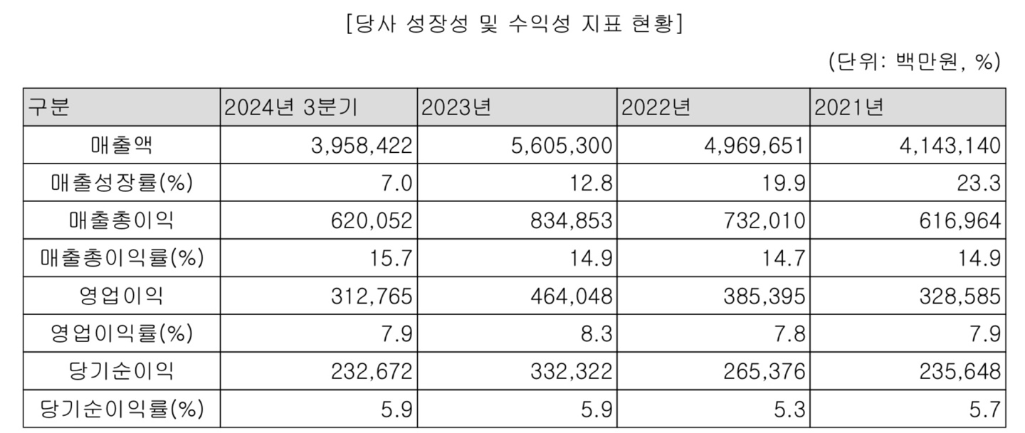 먼저 LG CNS의 재무제표입니다. 아무래도 오랫동안 사업을 이어온 기업이기 때문에 안정적이지만 성장성은 다소 높지 않은 것을 확인할 수 있습니다. 영업 이익률은 7.8%~8.3% 정도이며, 매출 성장률도 21년 23.3% 이후 23년 12.8%로 감소한 것을 알 수 있습니다.