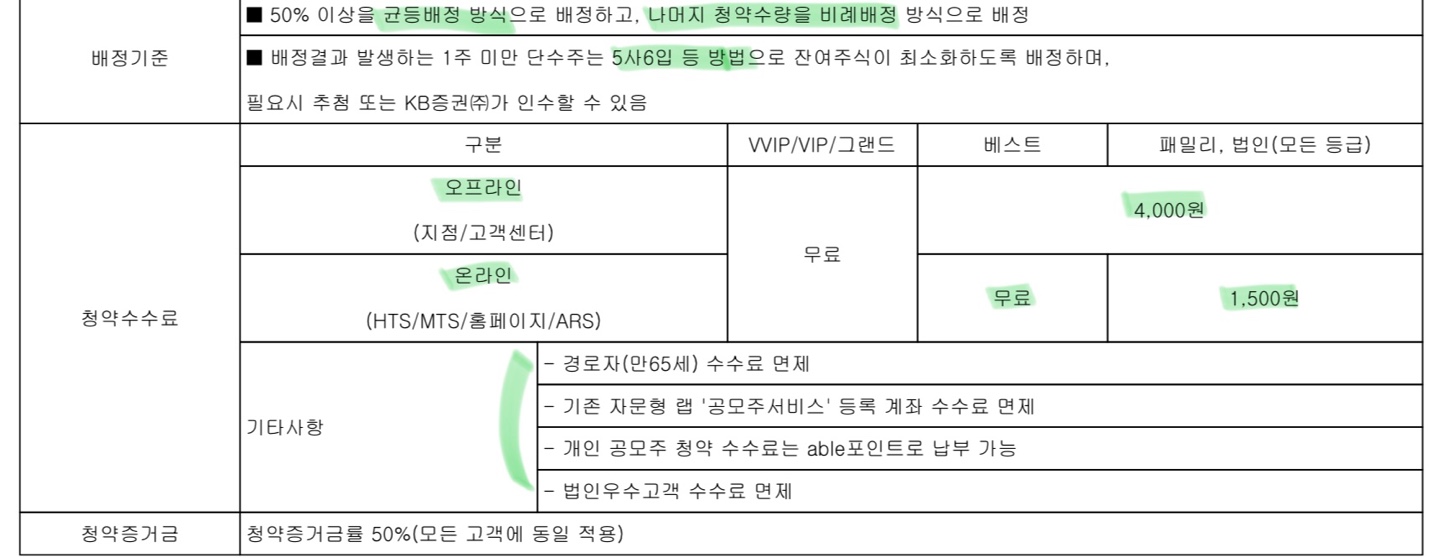 다음으로 중요한 것은 청약 수수료 부분입니다. KB증권에는 고객 등급이 있는데, 그 등급과 어디서 청약하는지에 따라 청약 수수료가 달라질 수 있습니다. 온라인으로 청약하는 경우에는 베스트 고객부터는 수수료가 면제되며, 다른 등급은 1,5000원의 청약 수수료가 필요합니다. 오프라인으로 하시는 경우에는 베스트 고객, 패밀리, 법인 등급의 고객은 4,000원의 청약 수수료가 부과됩니다.