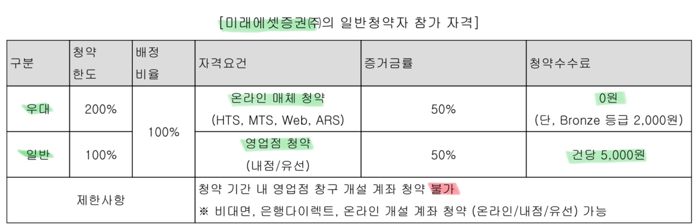 미래에셋증권의 일반 고객은 청약한도의 100%까지 청약이 가능하며, 우대 고객은 고객 구분에 따라 200~300%까지 청약이 가능합니다. 다. 다른 증권사에 비해 전자공시에 나온 일반 청약자 참가 자격 정보가 짧아서 다시 한번 살펴봤는데, 이렇게 요약본처럼 나온 것밖에 못 찾았습니다. 우대고객은 200%까지 가능하며, 브론즈 등급 외 온라인을 통해서 청약을 하는 경우에는 청약 수수료가 없으며 영업점으로 청약하는 경우에는 5,000원의 수수료가 필요합니다. 미래에셋증권의 우대 고객 기준은 해당 증권사에 문의하셔야 할 것 같습니다.