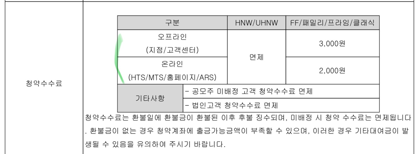 대신 오프라인 청약 고객 수수료는 다른 증권사보다 약간 더 저렴한 편입니다. 온라인으로 하는 경우에는 2,000원이 수수료로 빠져나갈 수 있지만, 지점이나 고객센터를 통해서 청약을 하는 경우에는 3,000원의 청약 수수료가 부과될 수 있습니다.