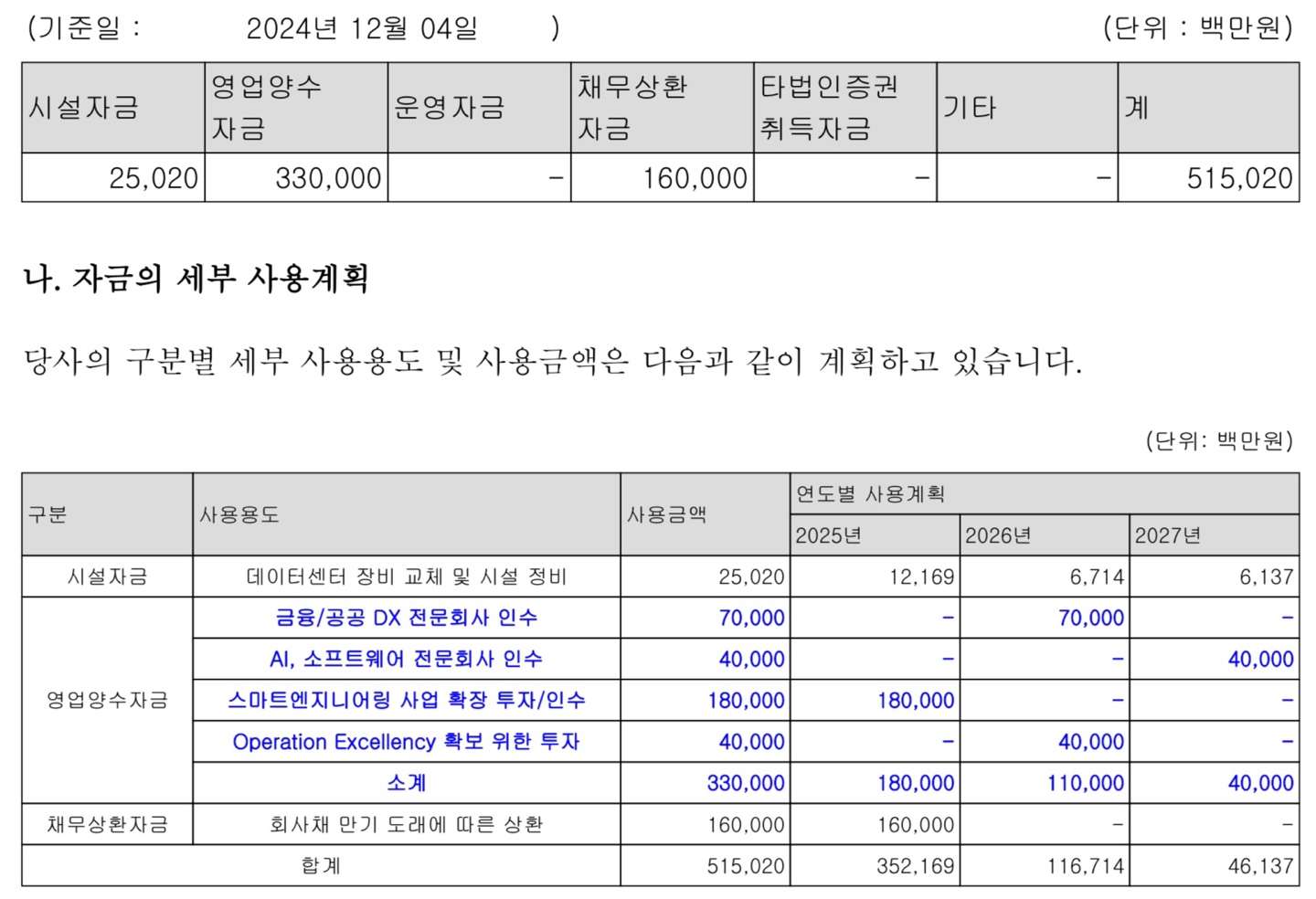 마지막으로 LG CNS 공모주의 자금 세부 사용 계획을 알아보도록 하겠습니다. LG CNS은 공모주 자금으로 시설과 영업양수, 운영 자금으로 활용하고 채무 상환을 할 계획이라고 합니다. 장비 교체 및 시설 정비를 하고 전문 회사를 인수한다는 계획을 밝히고 있습니다. 이상으로 주관사별 청약 자격, 청약 한도 및 LG CNS 상장 이후 유의해야 할 사항에 대해 알아보았습니다. 다음 LG CNS 공모주 관련으로는 수요 예측 결과 이후에 경쟁률과 공모주 청약에 필요한 정보를 정리할 계획입니다.