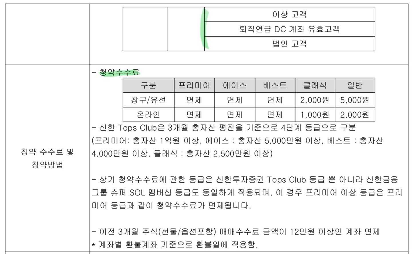 신한투자증권의 청약 수수료는 온라인으로 하는 경우 일반 등급은 2,000원, 클래식은 1,000원이며 창구와 유선을 통해서 청약을 한 고객분들은 일반 등급은 5,000원, 클래식 등급은 2,000원입니다. 확실히 온라인으로 하는 고객 쪽이 수수료가 덜 들 것 같습니다. 신한투자증권의 고객 등급은 3개월 총 자산 평잔을 기준으로 결정되는데, 프리미어 등급은 총 자산 1억 원 이상, 에이스 등급은 5,000만 원 이상, 베스트는 4,000만 원, 클래식 등급은 2,500만 원 이상입니다.