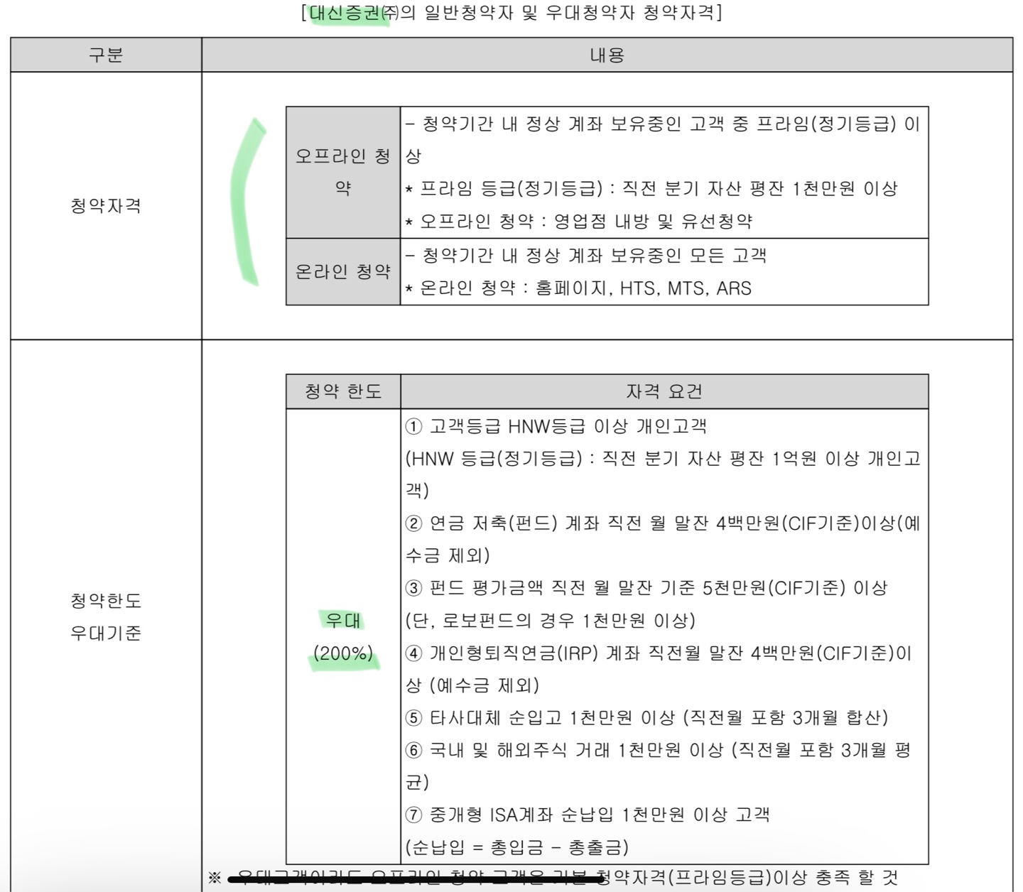 다음으로 대신증권입니다. 많은 주관사의 청약 조건에 대해 이야기한 것 같은데 아직 더 남았습니다. LG CNS 상장하기 전부터 일반 청약자뿐만 아니라 증권사도 관심이 있는 것 같습니다. 대신증권은 균등 배정에서 경쟁률이 낮았던 편으로 기억하는데, 이번에도 그럴지 잘 살펴보고 청약일정이 끝난 후 다시 한번 정리해 보도록 하겠습니다. 대신증권은 특이하게 오프라인 청약 고객에게 기준이 한 단계 더 적용되었습니다. 오프라인으로 청약을 하는 경우에는 평잔이 1천만 원 이상인 프라임 등급만 청약이 가능합니다.